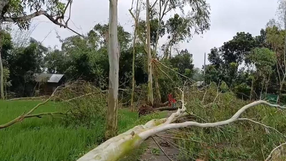 রবিবার (৫ অক্টোবর) ভোরের দিকে উপজেলার পাড়িয়া ইউনিয়নের পিয়াজুপাড়া, সুতাহারপাড়া, রায়মহল ও ভিতারবাড়ী এবং বড়পলাশবাড়ী ইউনিয়নের বাদামাবাড়ী এলাকায় এ ঝড়ের আঘাত হানে। মুহূর্তের ঝোড়ো বাতাসে ঘরবাড়ির টিনের চাল উড়ে যায়, গাছপালা উপড়ে পড়ে এবং বিদ্যুতের খুঁটি ভেঙে যায়।
