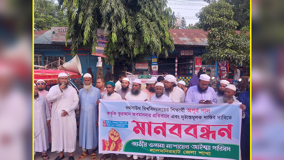 পবিত্র কুরআন শরীফ অবমাননার প্রতিবাদে এবং অভিযুক্ত নর্থ সাউথ বিশ্ববিদ্যালয়ের শিক্ষার্থী অপূর্ব পালের দৃষ্টান্তমূলক শাস্তির দাবিতে লালমনিরহাটে মানববন্ধন করেছে জাতীয় উলামা মাশায়েখ আইয়্যাহ্যা পরিষদ, লালমনিরহাট জেলা শাখা।