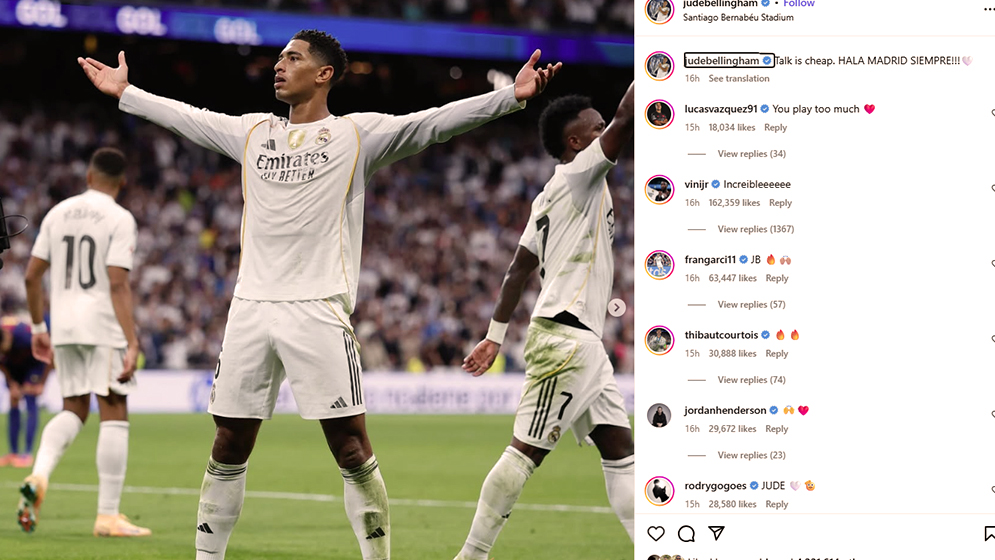 বেলিংহাম এই পোস্ট দিয়ে মূলত ইয়ামালের দিকেই ইঙ্গিইত করেছেন। আবার বেলিংহামের এই পোস্টের নিচে মন্তব্য করেছেন রিয়ালের সাবেক তারকা ফুটবলার লুকাস ভাজকেজ। তিনি লিখেছেন, ‘You play too much যার অর্থ তুমি খুব বেশিই খেলো’। ভাজকেজও এই মন্তব্য দিয়ে মূলত ইয়ামালকেই ইঙ্গিত করেছেন। বুঝিয়েছেন ইয়ামাল খেলা বাদ দিয়ে কথা বলাতেই বেশি মনোযোগী। আর রিয়ালের ফুটবলাররা কথার জবাব মাঠেই দেন।