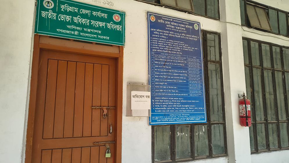 কুড়িগ্রাম জেলা প্রশাসকের কার্যালয়ের নিচতলায় অবস্থিত জাতীয় ভোক্তা অধিকার সংরক্ষণ অধিদপ্তরের জেলা অফিসের সামনে সকাল সাড়ে ১১টার দিকে দুই মধ্যবয়সী মানুষ অপেক্ষা করছিলেন। তারা ৫০ কিলোমিটার দূরের ভূরুঙ্গামারী উপজেলা থেকে এসেছেন অভিযোগ জানাতে। কিন্তু সামনে ঝুলছে বড় তালা, ভেতরে কেউ নেই। কোনো নম্বরেও যোগাযোগ করা যাচ্ছে না কারণ জাতীয় তথ্য বাতায়নে দপ্তরটির কোনো সরকারি ফোন নম্বর নেই, অফিসের সামনে ঝুলানো চার্টের নম্বরটিও বন্ধ।