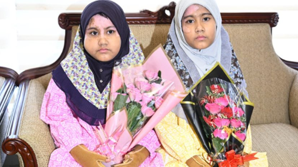 জাতীয় বার্ন অ্যান্ড প্লাস্টিক সার্জারি ইনস্টিটিউটে প্রায় সাড়ে তিন মাস চিকিৎসাধীন থাকার পর বাড়ি ফিরল মাইলস্টোন স্কুল অ্যান্ড কলেজে প্রশিক্ষণ বিমান বিধ্বস্তের ঘটনায় আহত দশ বছর বয়সী যমজ শিশু সারিনাহ জাহান সায়রা ও সাইবাহ জাহান সায়মা।