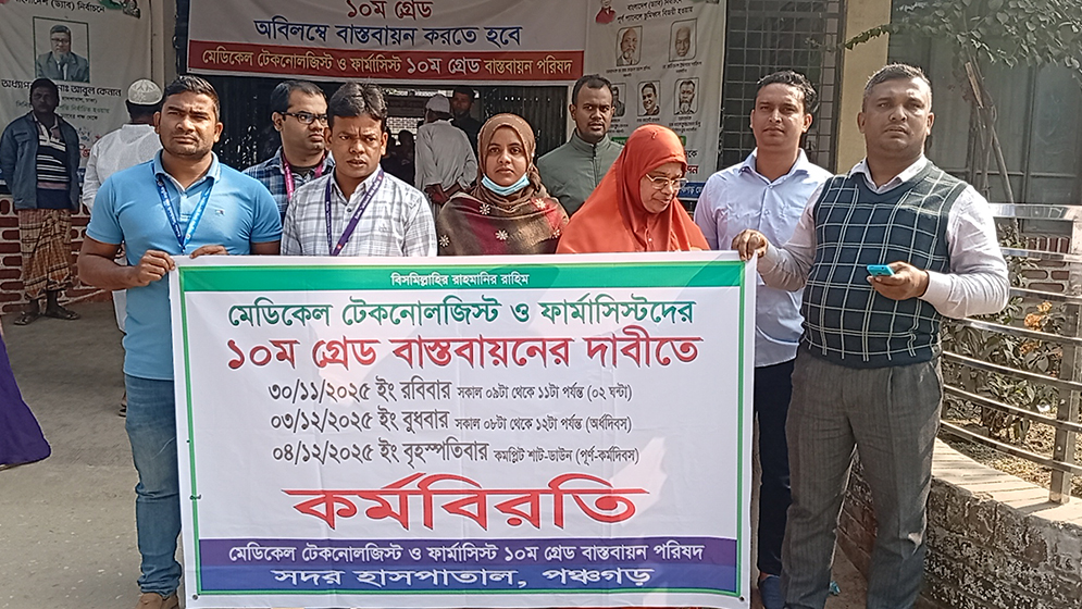 পঞ্চগড় আধুনিক সদর হাসপাতালে কর্মরত মেডিকেল টেকনোলজিস্টরা দশম গ্রেড বাস্তবায়নের দাবিতে তৃতীয় দিনের মতো সকল কর্ম বিরতি পালন করেছে।