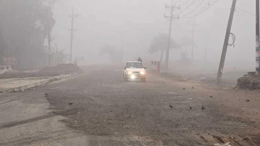 নওগাঁয় দুদিনেও দেখা মেলেনি সূর্যের। সকাল পেরিয়ে দুপুরে হয়েছে। তবুও দেখা নেই আলোর। ফলে ঘন কুয়াশায় ঢেকে আছে চারদিক। ঝরছে বৃষ্টির মতো কুয়াশা। তার সঙ্গে যুক্ত হয়েছে ঠান্ডা হিমেল বাতাস। এ অবস্থাতে দিনের বেলাতেও যানবাহনগুলোকে হেডলাইট জ্বালিয়ে চলাচল করতে দেখা গেছে।
