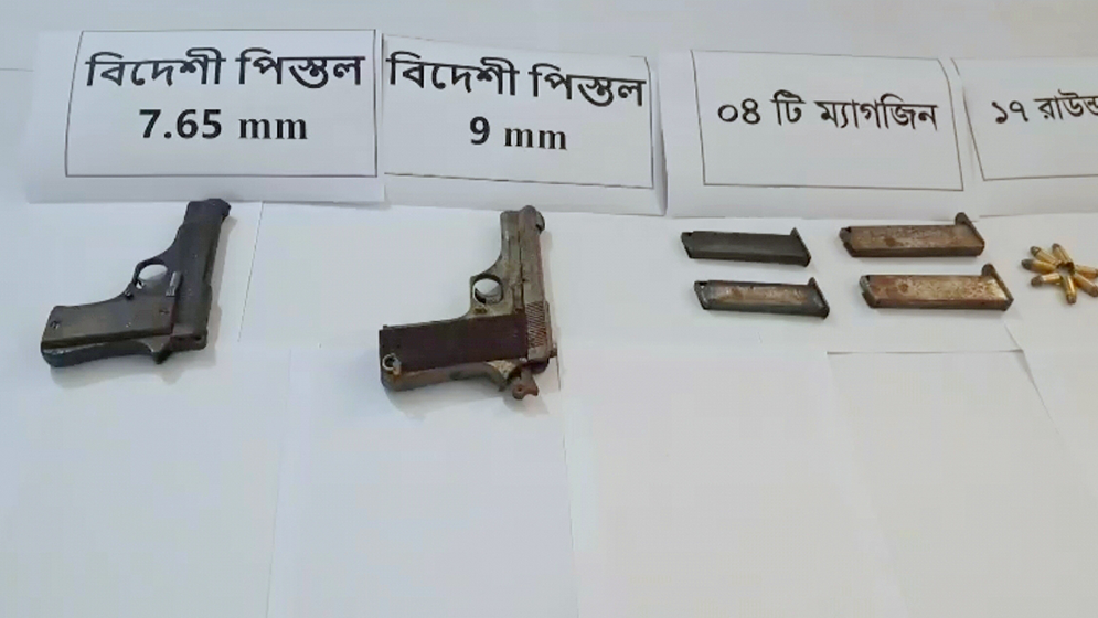 উদ্ধারকৃত অস্ত্রের মধ্যে রয়েছে একটি ৭.৬৫ এমএম বোরের বিদেশি পিস্তল, দুটি ম্যাগজিনসহ ১০ রাউন্ড তাজা গুলি একটি ৯ এমএম বোরের বিদেশি পিস্তল, দুটি ম্যাগজিনসহ ৭ রাউন্ড তাজা গুলি।