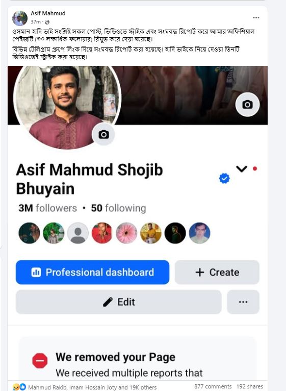 ফেসবুক পোস্টে আসিফ মাহমুদ লেখেন, ওসমান হাদি ভাই সংশ্লিষ্ট সব পোস্ট, ভিডিওতে স্ট্রাইক এবং সংঘবদ্ধ রিপোর্ট করে আমার অফিশিয়াল পেজটি (৩০ লাখের বেশি ফলোয়ার) রিমুভ করে দেওয়া হয়েছে।