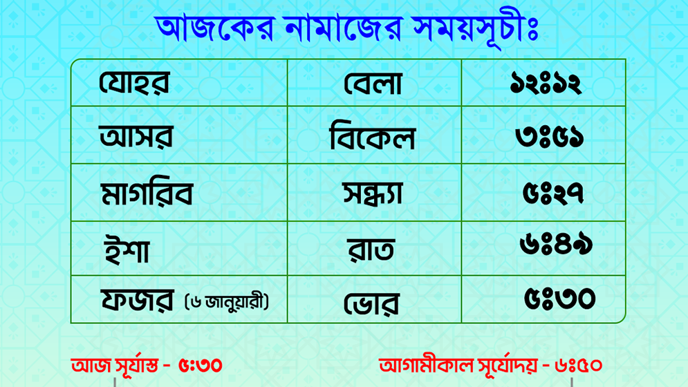আগামীকাল ফজরের নামাজ শুরু হবে ভোর ৫টা ৩০ মিনিটে।
