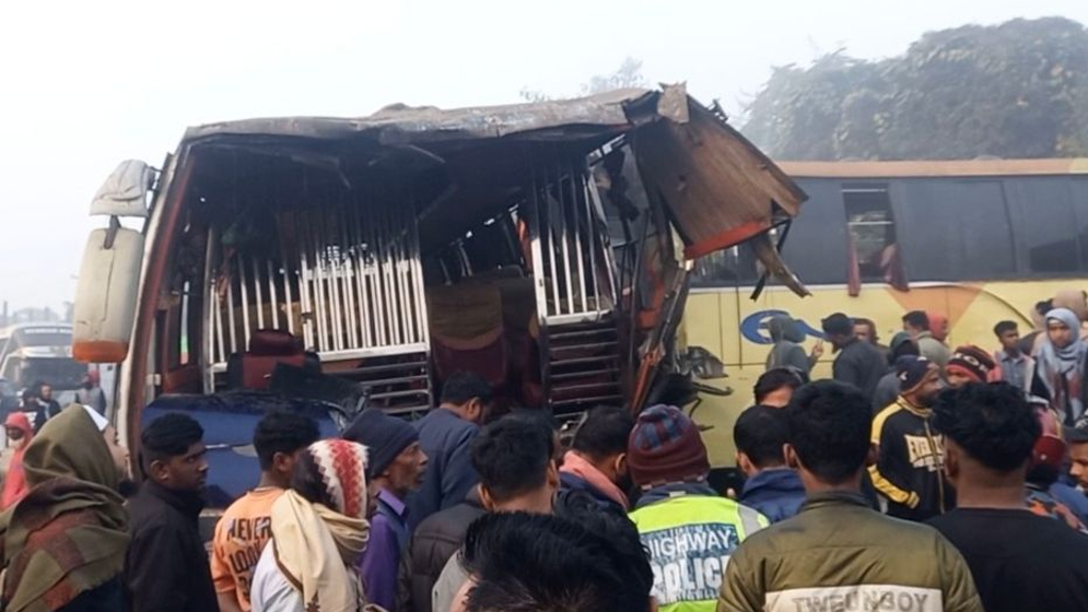 পুলিশ ও প্রত্যক্ষদর্শী সূত্রে জানা যায়, শনিবার সকাল ৭টার দিকে ঢাকা-সিলেট মহাসড়কের দয়ামীর মাদ্রাসার সামনে সিলেটগামী শ্যামলী পরিবহণের (ঢাকা মেট্রো- ব- ২৪ -৪২৮৬) ঢাকাগামী এনা পরিবহণের বাসের (ঢাকা মেট্রো-ব-১২-৩৫৬০) মুখোমুখি সংঘর্ষ ঘটলে ঘটনাস্থলেই দুজন নিহত হন। এ সময় উভয় বাসের আরও অন্তত ১২ জন আহত হয়। তাৎক্ষণিকভাবে তাজপুর ফায়ার সার্ভিসের সদস্য ও পুলিশ হতাহতদের উদ্ধার করে সিলেট ওসমানী মেডিকেল কলেজ হাসপাতালে পাঠায়।