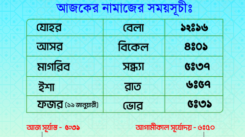 সময়সূচি অনুযায়ী, ১৯ ফেব্রুয়ারি প্রথম রমজানে ঢাকায় সেহরির শেষ সময় ভোররাত ৫টা ১২ মিনিট ও ইফতারির সময় ৫ টা ৫৮ মিনিট।