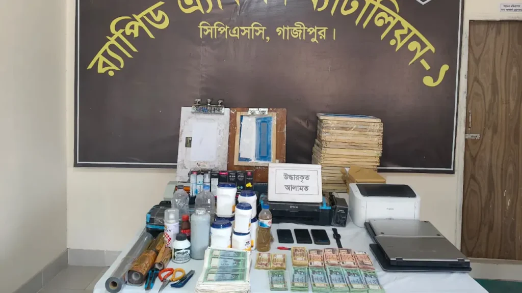 র্যাব সূত্রে জানা গেছে, অভিযানকালে তাদের হেফাজত থেকে ৫ লাখ ৪০ হাজার টাকা মূল্যমানের প্রস্তুত জাল নোট, কাগজে প্রিন্ট করা অবস্থায় ৯ লাখ ১০ হাজার টাকার জাল নোট, নগদ ১ হাজার ৯০০ টাকা এবং জাল টাকা তৈরির বিপুল পরিমাণ সরঞ্জাম উদ্ধার করা হয়। এ সময় তিনজনকে হাতেনাতে আটক করা হয়। উদ্ধারকৃত সরঞ্জামের মধ্যে রয়েছে—৪টি প্রিন্টার, ৩টি ল্যাপটপ, লেমিনেটিং মেশিন, পেপার কাটার, স্ক্যানার, বিভিন্ন রঙের প্রিন্টার কালি, স্ক্রিন ফ্রেম, কেমিক্যাল, স্পিরিট, বিপুল পরিমাণ কাগজ ও একাধিক মোবাইল ফোন।