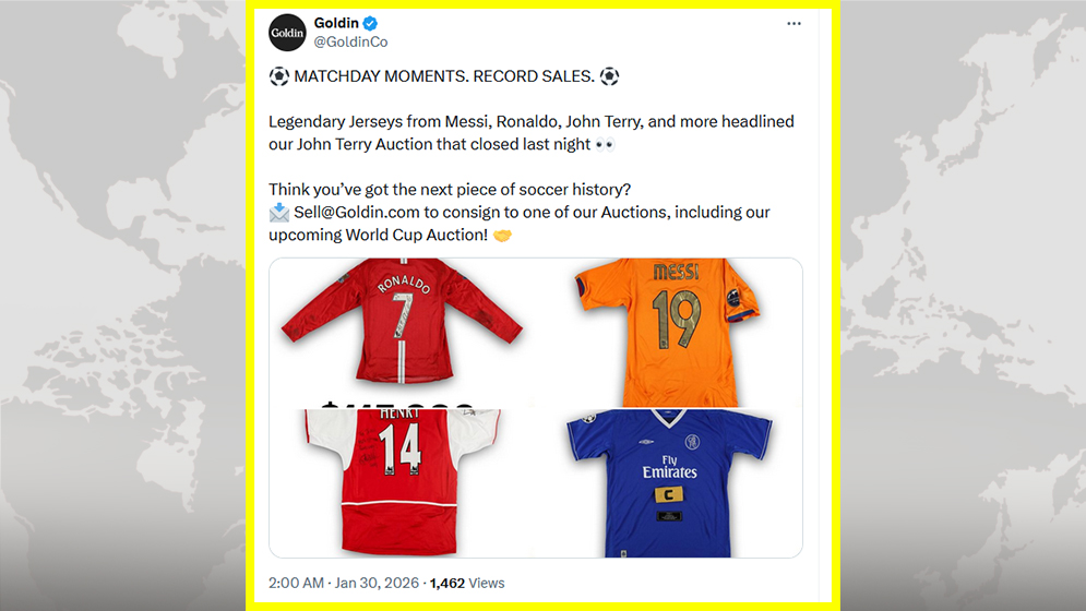 আমেরিকান নিলাম প্রতিষ্ঠান ‘গোল্ডিন অকশনস’ এটি পরিচালনা করেছে। যেখানে সর্বোচ্চ দাম উঠেছে আর্জেন্টাইন মহাতারকা মেসির জার্সির। ২০০৬ সালের ১৮ অক্টোবর চেলসি ও বার্সেলোনা চ্যাম্পিয়ন্স লিগের গ্রুপপর্বের ম্যাচে মুখোমুখি হয়েছিল। চেলসির তৎকালীন তারকা টেরির সংগ্রহে ছিল সেই ম্যাচে পরিহিত মেসির জার্সিটি। নিলামে এর দাম উঠেছে ১ লাখ ৮৩ হাজার ডলার বা ২ কোটি ২৫ লাখ টাকার বেশি।