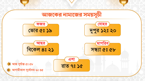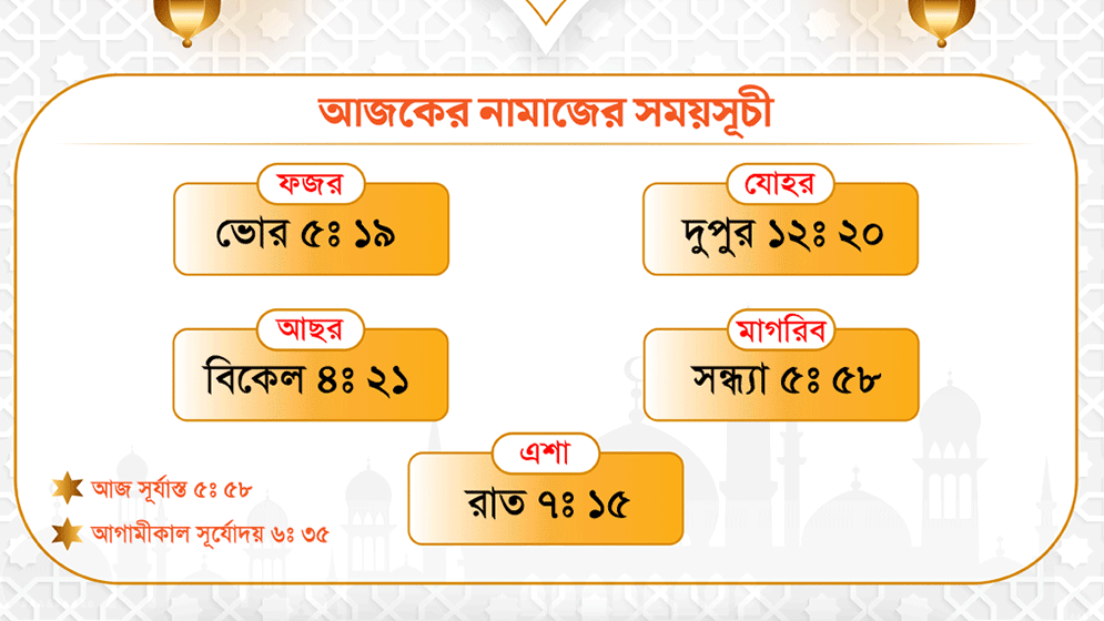মাগরিবের নামাজ পড়তে হবে সন্ধ্যা ৫টা ৫৮ মিনিটে।
