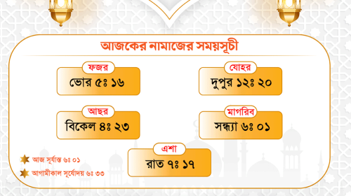 এবং ইশার নামাজের সময় শুরু হবে রাত ৭টা ১৮ মিনিটে।