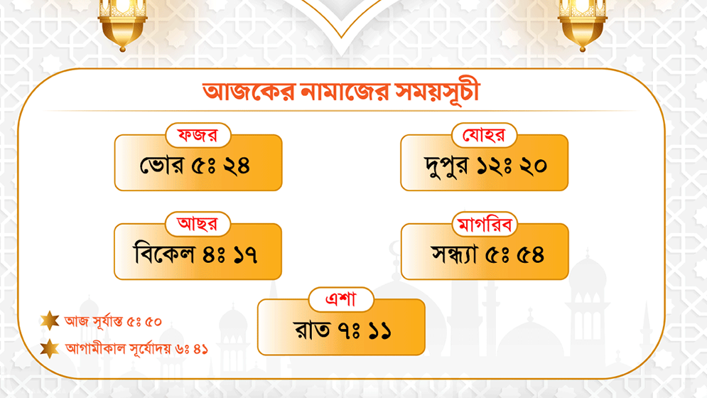 মাগরিবের নামাজ পড়তে হবে সন্ধ্যা ৫টা ৫৩ মিনিটে।