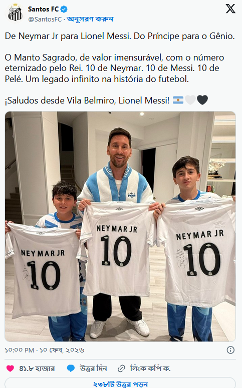 এর আগে বার্সেলোনা এবং প্যারিস সেইন্ট জার্মেইয়ের (পিএসজি) হয়ে একসঙ্গে খেলেছেন মেসি ও নেইমার। জানা গেছে, মেসির তিন ছেলের জন্যই সান্তোসের নতুন জার্সিটি পাঠান ব্রাজিলিয়ান ফরোয়ার্ড। তবে ছবিতে দেখা যায় দুজনকে, সেই ছবি পোস্ট করে সান্তোস লিখেছে, ‘নেইমার জুনিয়র থেকে লিওনেল মেসি, প্রিন্স থেকে জিনিয়াস। এটি পবিত্র স্মারক (জার্সি), যার মূল্য অপরিমেয়, সংখ্যাটিও (১০) রাজার (পেলে) সঙ্গে অমর হয়ে আছে। নেইমার, মেসি এবং পেলের ১০ নম্বর। ফুটবলের ইতিহাসে এটি অসীম উত্তরাধিকার। ভিলা বেলমিরো থেকে স্বাগতম, লিওনেল মেসি।’