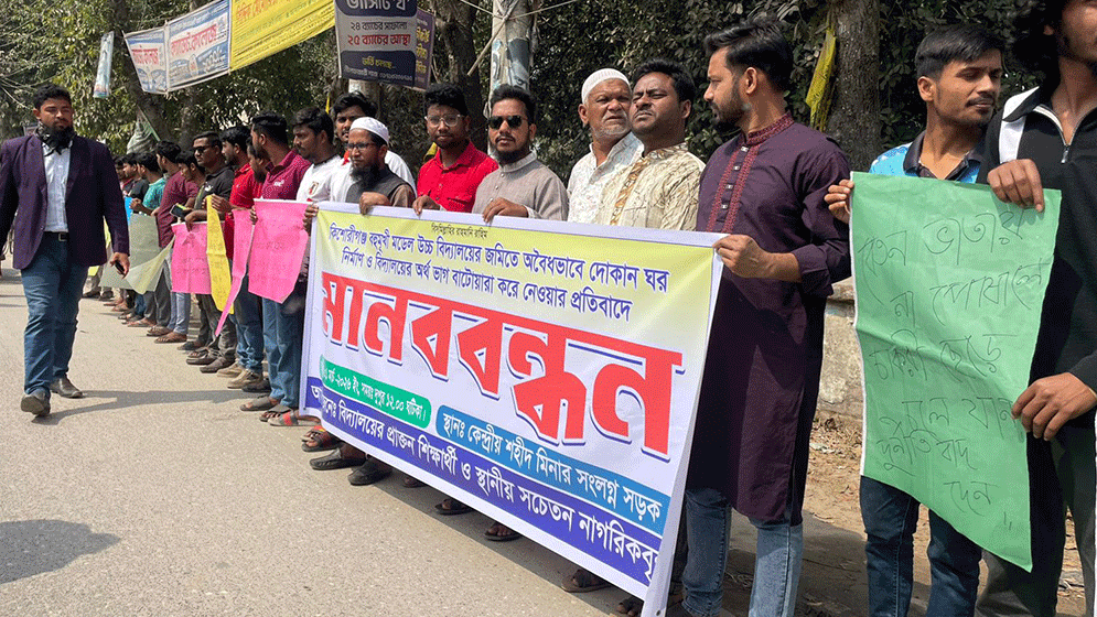 রোববার ( ১ মার্চ) সকালে কিশোরীগঞ্জ বহুমুখী মডেল উচ্চ বিদ্যালয়ের সামনে এ মানববন্ধন অনুষ্ঠিত হয়।