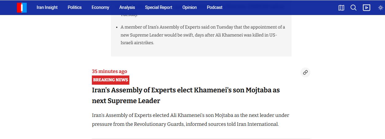 প্রতিবেদনে বলা হয়েছে, ইরানের অ্যাসেম্বলি অব এক্সপার্ট খামেনির ছেলে মোজতাবাকে পরবর্তী সর্বোচ্চ নেতা হিসেবে নির্বাচিত করেছে। এর আগে সংবাদমাধ্যমটি জানায়, ইরানের সর্বোচ্চ নেতা আয়াতুল্লাহ আলি খামেনির মরদেহ উত্তর-পূর্বাঞ্চলীয় শহর মাশহাদে দাফন করা হবে। প্রতিবেদনে বলা হয়, খামেনির জানাজা শেষে তাকে তার নিজ শহর মাশহাদে সমাহিত করা হবে। পাশাপাশি রাজধানীতে একটি বড় পরিসরের গণশোক অনুষ্ঠান আয়োজনের পরিকল্পনাও করা হচ্ছে।