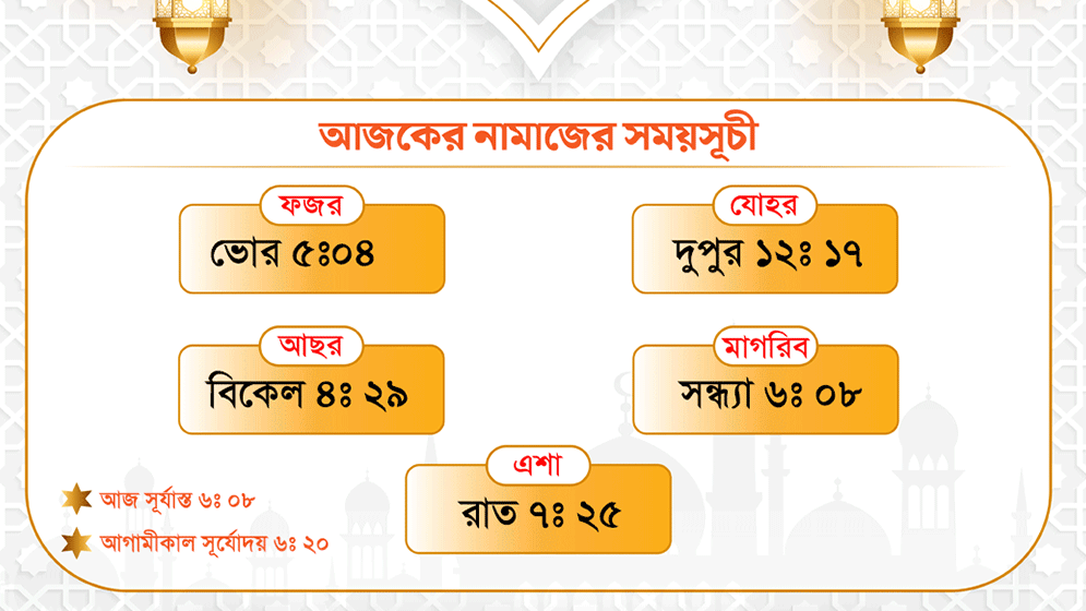 মাগরিবের নামাজ পড়তে হবে সন্ধ্যা ৬টা ০৮ মিনিটে।