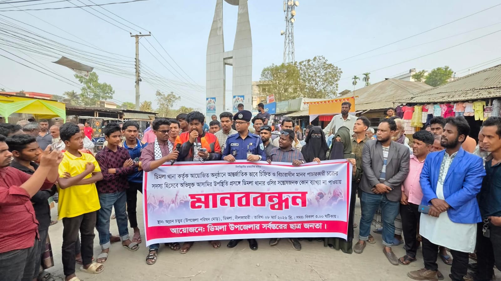 নীলফামারীর ডিমলা থানা পুলিশের ভারপ্রাপ্ত কর্মকর্তা (ওসি) শওকত আলীর বিরুদ্ধে নানা অভিযোগ তুলে তার বদলীর দাবিতে মানববন্ধন চলছিলো। এসময়ে হঠাৎ করে ওসি ঘটনাস্থলে এসে মানববন্ধনের সামনের সারিতে দাঁড়িয়ে যায়।