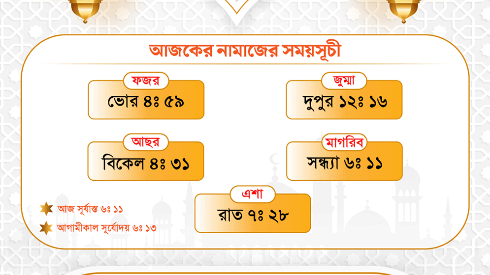 মাগরিবের নামাজ পড়তে হবে সন্ধ্যা ৬টা ১১ মিনিটে।