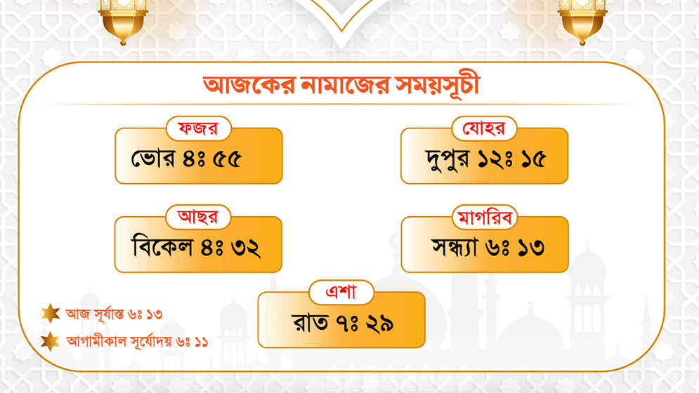 মাগরিবের নামাজ পড়তে হবে সন্ধ্যা ৬টা ১৩ মিনিটে।