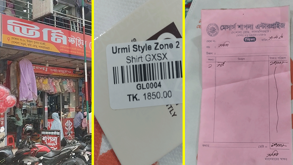 নাম প্রকাশে অনিচ্ছুক এক ভুক্তভোগী ক্রেতা জানান, শহরের বাটামোড় এলাকায় অবস্থিত ‘উর্মি স্টাইল জোন-২’ নামের একটি দোকান থেকে তিনি ১ হাজার ৮৫০ টাকায় একটি শার্ট কেনেন। পরে বিক্রয় রশিদ চাইলে দোকানের মালিক ও কর্মচারীরা রশিদ দিতে অস্বীকৃতি জানান।