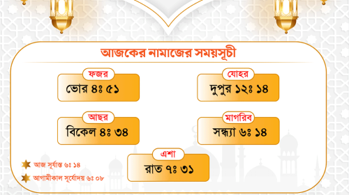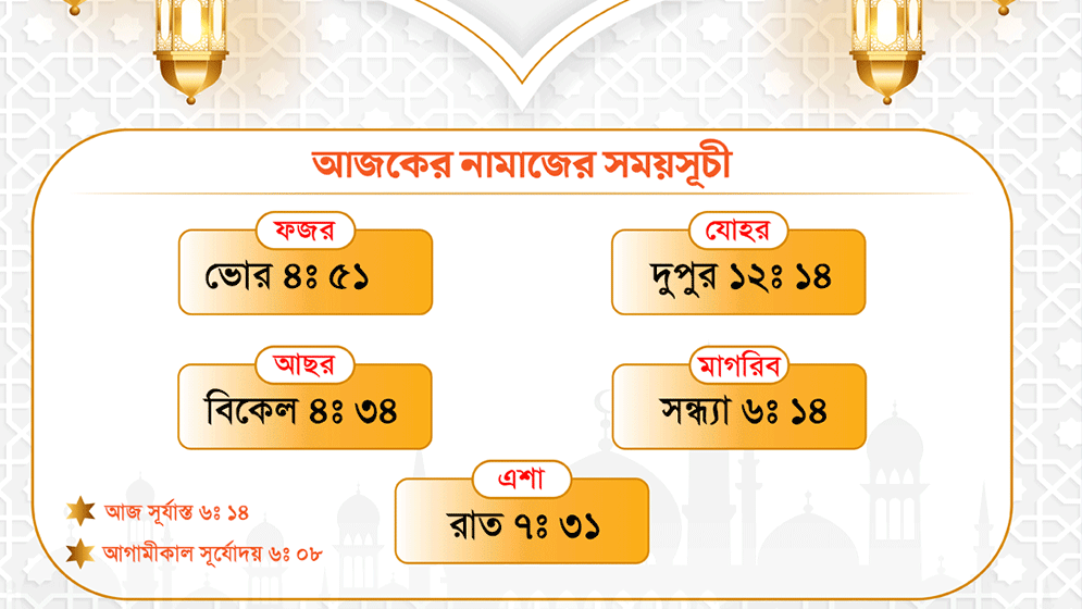 মাগরিবের নামাজ পড়তে হবে সন্ধ্যা ৬টা ১৪ মিনিটে।