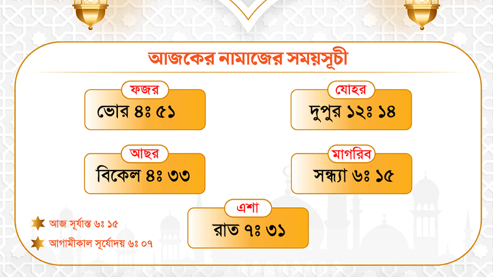 মাগরিবের নামাজ পড়তে হবে সন্ধ্যা ৬টা ১৫ মিনিটে।