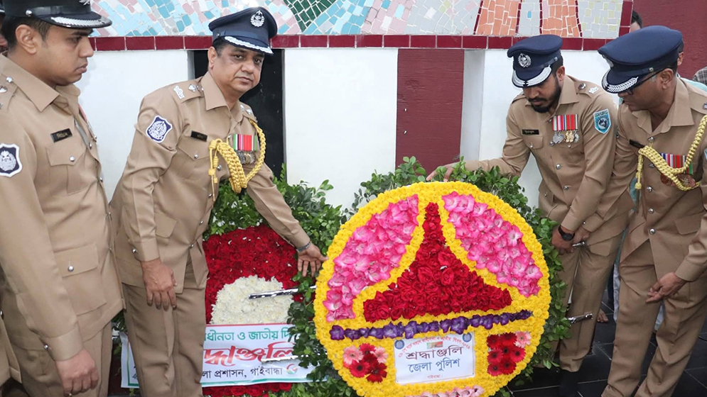 সূর্যোদয়ের সাথে সাথে গাইবান্ধা পৌরপার্কস্থ বিজয় স্তম্ভে জেলা পুলিশের পক্ষ থেকে পুষ্পস্তবক অর্পণ করেন পুলিশ সুপার।