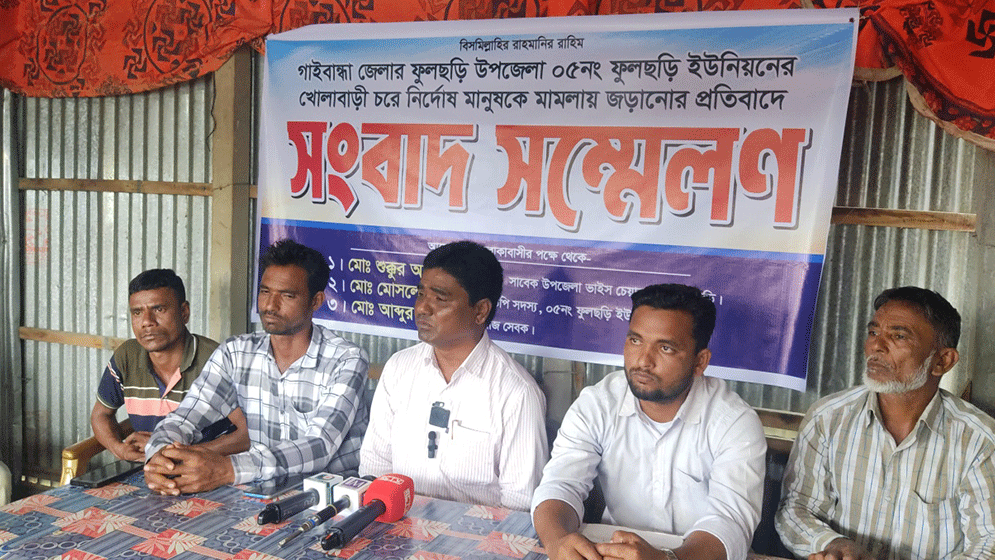 হত্যা মামলার আসামী ক্ষীপ্ত হয়ে চরের ৫০ পরিবারের সদস্যদের আসামী করে মিথ্যা মারপিট ও ভাংচুরের মামলা করেছেন। ঘটনাটি ঘটেছে গাইবান্ধার ফুলছড়ি উপজেলার খোলাবাড়ী গ্রামে। এদিকে এ ঘটনার প্রতিবাদ জানিয়ে ২৯ মার্চ ফুলছড়ির ক্লিনিক বাজারে সংবাদ সম্মেলন করেন ভুক্তভোগী পরিবারের সদস্যরা।