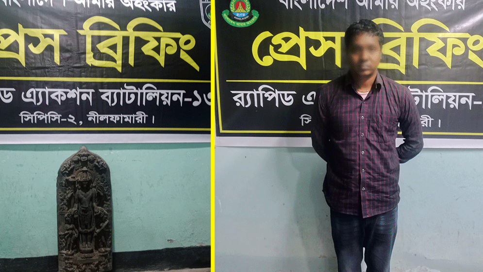 র্যাব জানায়, গতকাল বুধবার বিকেলে জেলার দেবীগঞ্জ উপজেলার দণ্ডপাল ইউনিয়নের খগেরহাট ধনমণ্ডল এলাকার একটি বসতবাড়ীর সামনে ফাঁকা জায়গা থেকে র্যাব ১৩, সিপিসি-২, নীলফামারী ক্যাম্পের একটি আভিযানিক দল গোপন সংবাদের ভিত্তিতে অভিযান পরিচালনা করেন এবং অভিযান চলাকালে ২৯ কেজি ওজনের একটি কষ্টিপাথরের মূর্তিসহ সুজন মোহন্ত নামে ওই ব্যক্তিকে আটক করেন৷ পরে প্রাথমিক জিজ্ঞাসাবাদে গ্রেফতারকৃত আসামি বিষ্ণু কষ্টিপাথরের মূর্তিটি সংরক্ষণ করে পাশ্ববর্তী দেশে পাচারের চেষ্টা করছিল বলে স্বীকারোক্তি দিয়েছে।