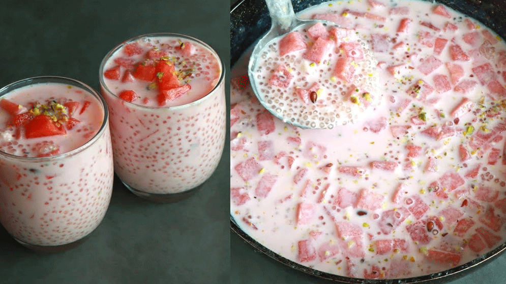 সাবুদানা সেদ্ধ করে ঠান্ডা পানি দিয়ে ধুয়ে পানি ঝরিয়ে নিন। দুধ জ্বাল দিয়ে তাতে কনডেন্সড মিল্ক মিশিয়ে নিন ঠান্ডা করে নিন। এবার একটি পাত্রে ঠান্ডা দুধ, সাবুদানা, জেলি ও রুহ আফজা মিশিয়ে নিন। সবার শেষে তাতে যোগ করুন কিউব করে কাটা তরমুজ। এরপর ফ্রিজে রেখে ভালো করে ঠান্ডা করে নিন। উপরে বাদাম কুচি সাজিয়ে পরিবেশন করুন।