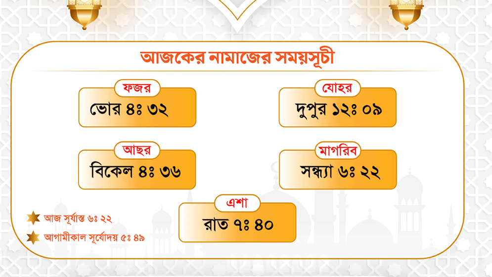 মাগরিবের নামাজ পড়তে হবে সন্ধ্যা ৬টা ২২ মিনিটে।