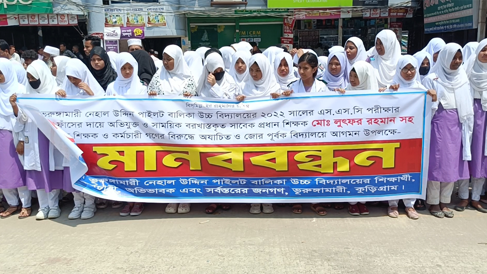 কুড়িগ্রামের ভূরুঙ্গামারীতে এসএসসি পরীক্ষার প্রশ্নপত্র ফাঁসের ঘটনায় অভিযুক্ত শিক্ষকদের পুনরায় বিদ্যালয়ে সংযুক্ত করার প্রতিবাদে মানববন্ধন ও স্মারকলিপি প্রদান করেছেন শিক্ষার্থী ও অভিভাবকরা।