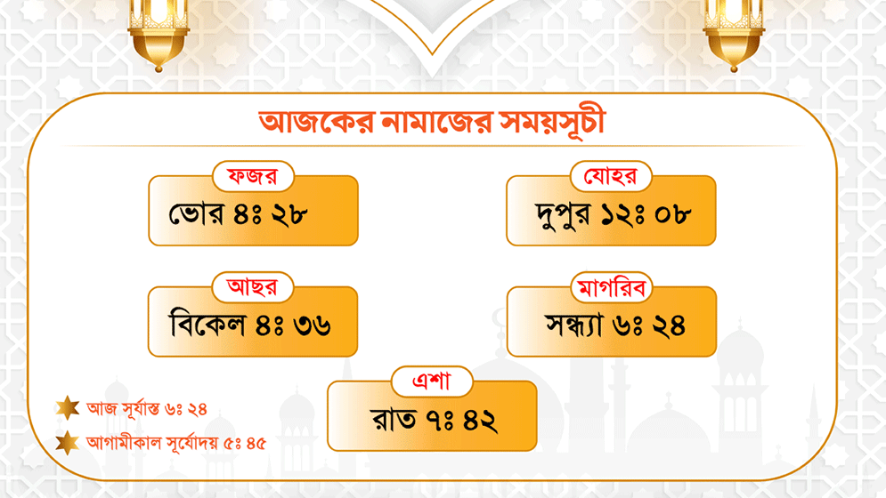 এবং ইশার নামাজের সময় শুরু হবে রাত ৭টা ৪২ মিনিটে।