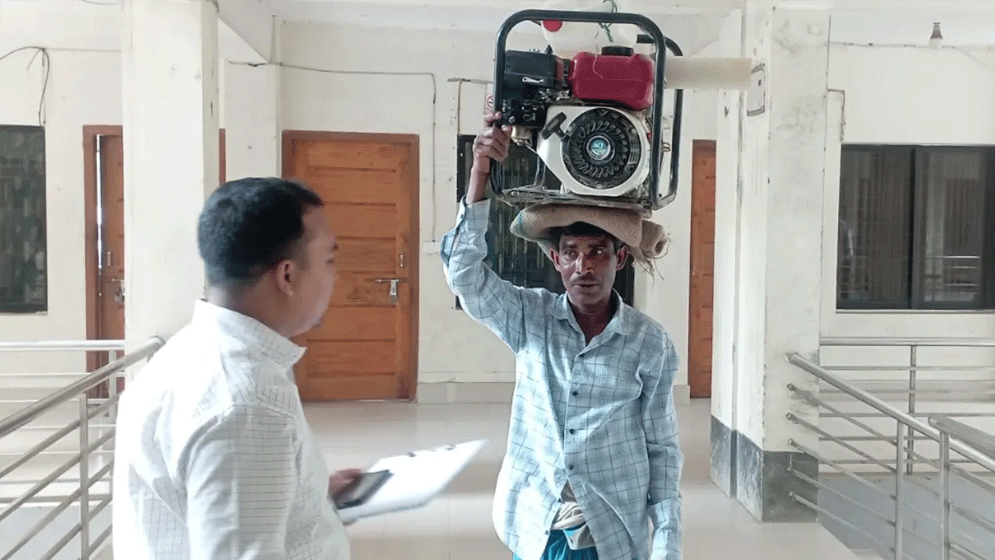 তিনি আরও জানান, বড় স্যারেরা নিয়ম করেছে তেলের কার্ড করতে হবে। তার প্রমাণ হিসাবে জেনারেটর মাথায় করে নিয়ে এসেছি। এজন্য কৃষি স্যারের কাছে একটা লিখিত আবেদন নিয়ে এসেছি।