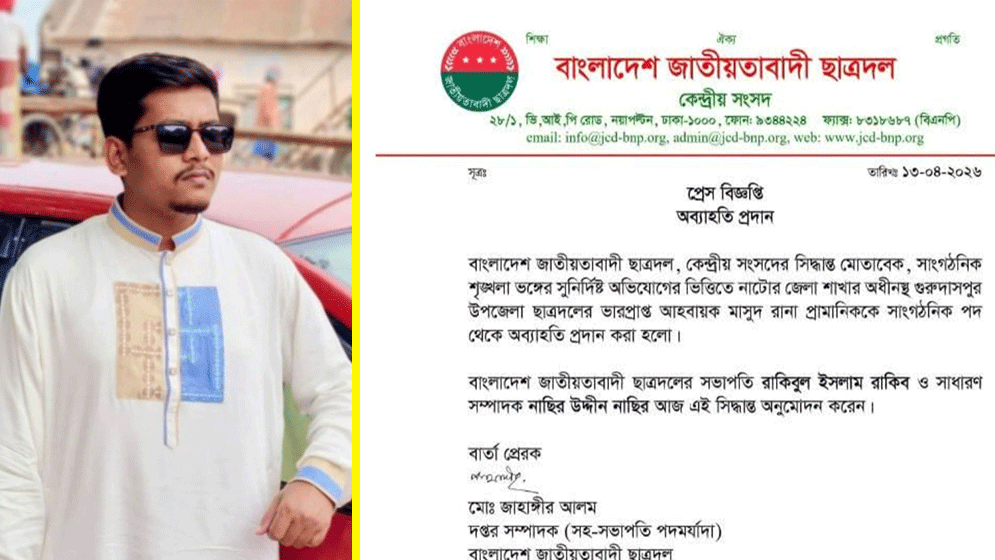 নাটোর জেলা ছাত্রদলের সাধারণ সম্পাদক মারুফ ইসলাম সৃজন বলেন, বিষয়টি কেন্দ্রীয় ছাত্রদলের নজরে আসার পর সাংগঠনিক শৃঙ্খলা ভঙ্গের সুনির্দিষ্ট অভিযোগে তাকে দলীয় পদ থেকে অব্যাহতি দেওয়া হয়েছে।