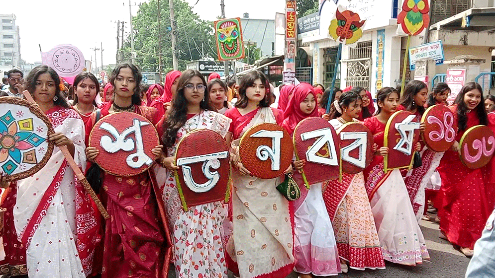 এরপর জেলা প্রশাসক কার্যালয় থেকে একটি বর্ণাঢ্য শোভাযাত্রা বের হয়ে শহরের গুরুত্বপূর্ণ সড়ক প্রদক্ষিণ করে ডিসি মোড় প্রাঙ্গণে গিয়ে শেষ হয়। শোভাযাত্রায় বিভিন্ন শিক্ষা প্রতিষ্ঠান, সাংস্কৃতিক সংগঠন ও নানা শ্রেণি-পেশার মানুষ অংশগ্রহণ করেন। রঙিন ব্যানার, ফেস্টুন ও ঐতিহ্যবাহী সাজে সজ্জিত অংশগ্রহণকারীদের উপস্থিতিতে উৎসবমুখর হয়ে ওঠে পুরো শহর।
