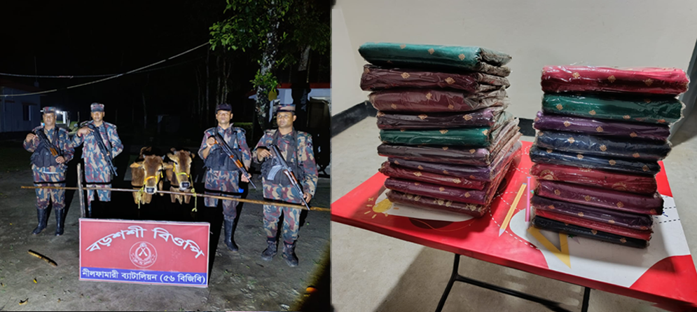 বিজিবি জানায়, নীলফামারী-৫৬ বিজিবি ব্যাটালিয়নের অধীনস্ত বোদা উপজেলার কালিয়াগঞ্জ ইউনিয়নের ধামেরঘাট বিওপির টহলদল সীমান্ত পিলার ৭৭০ হতে আনুমানিক ২০০ গজ বাংলাদেশের অভ্যন্তরে ধামেরঘাট পেয়ারা বাগান নামক স্থান থেকে অভিযান পরিচালনা করে ভারতীয় ২০ পিস শাড়ি মালিকবিহীন অবস্থায় জব্দ করে।