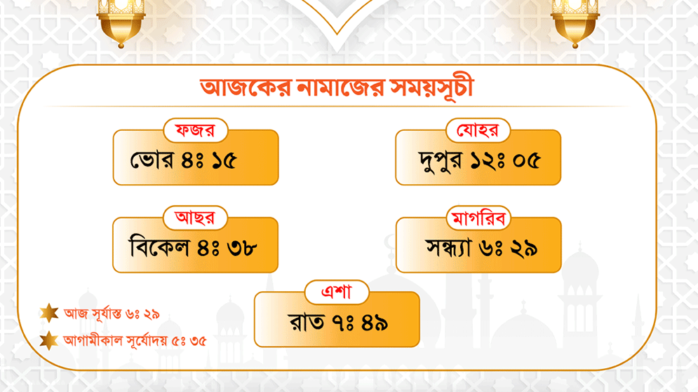আগামীকাল ফজরের নামাজ শুরু হবে ভোর ৪টা ১৫ মিনিটে।