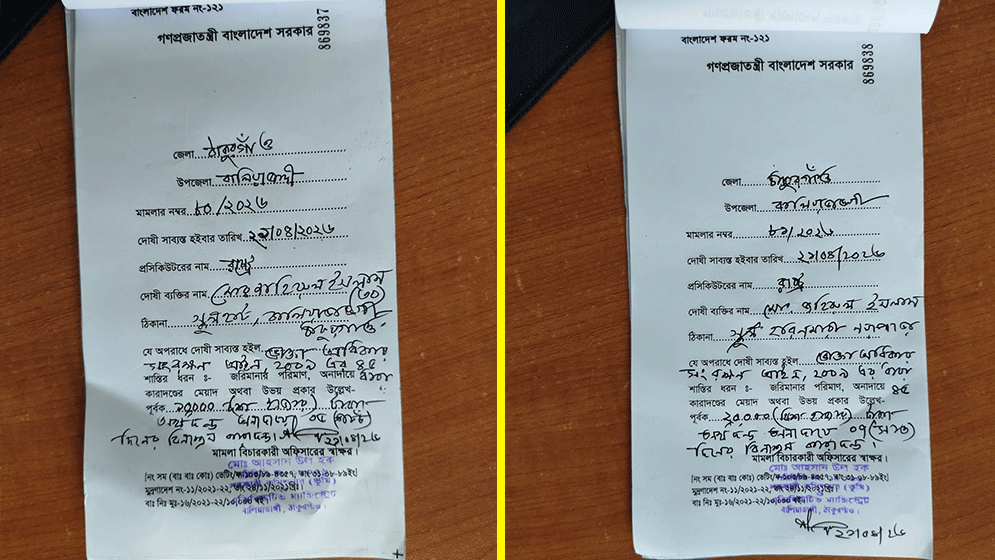 পরবর্তীতে মঙ্গলবার দুপুর সাড়ে ১টার দিকে উপজেলা সহকারী কমিশনার (ভূমি) মোঃ আহসান উল হক ভ্রাম্যমাণ আদালত পরিচালনা করেন। আদালতে জিজ্ঞাসাবাদ শেষে একজনকে ২০ হাজার টাকা জরিমানা, অনাদায়ে ৭ দিনের কারাদণ্ড এবং অপরজনকে ১০ হাজার টাকা জরিমানা, অনাদায়ে ৫ দিনের কারাদণ্ড প্রদান করা হয়।