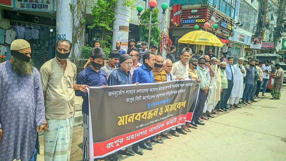 রংপুরে সড়ক সংস্কারের দাবিতে মুখে কালো কাপড় বেঁধে মানববন্ধন