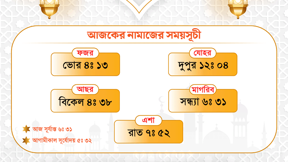 মাগরিবের নামাজ পড়তে হবে সন্ধ্যা ৬টা ৩১ মিনিটে।