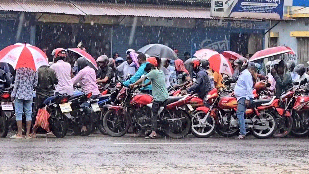 ঠাকুরগাঁওয়ে ঝড়-বৃষ্টি তোয়াক্কা না করেই পেট্রোল পাম্পগুলোতে দেখা গেছে মানুষের উপচে পড়া ভিড়। টানা বৃষ্টির মধ্যেও তেলের আশায় দীর্ঘ লাইনে দাঁড়িয়ে শত শত মোটরসাইকেল চালক।