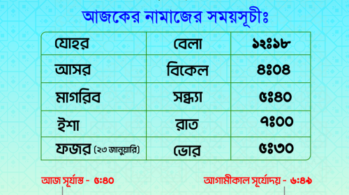যোহরের নামাজ আদায় করা যাবে দুপুর ১২টা ১৭ মিনিটে। আসরের নামাজের সময় নির্ধারিত হয়েছে বিকেল ৪টা ০১ মিনিটে। মাগরিবের নামাজ পড়তে হবে সন্ধ্যা ৫টা ৩৭ মিনিটে। এবং ইশার নামাজের সময়…